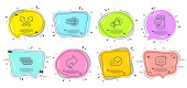Przewiń w dół, Przytrzymaj znaki gestu serca i ekranu dotykowego. Pęcherzyki mowy z cytatami. Budynki drapaczy chmur, Zatwierdzone i Wyślij ikony linii pola zestaw. Rekrutacja, symbole call center. Wektor
