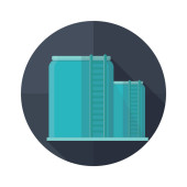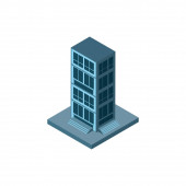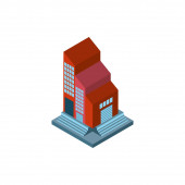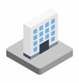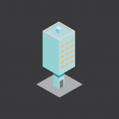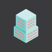 izometryczne 3d renderowanie budynku fabrycznego z dachem i pudełkiem na własny tekst