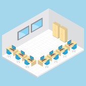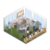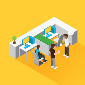 izometryczne wnętrze lobby domu z urządzeniami elektronicznymi i stołem w biurze