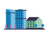 Żółty niebieski i różowy budynek miasta krajobraz z chmur i drzew projektowania