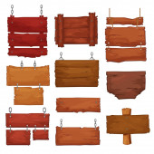 Drewniane deski. Rustykalny drewniany szyld, puste banery, wiszące billboard i retro drewna znaków wektor ilustracji ikony zestaw