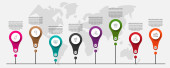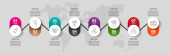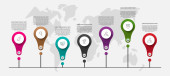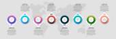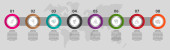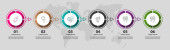 Infografika z 7 okręgów i strzałek. Nowoczesny wzór wektora. Może być stosowany dla siedmiu firm, sieci web, baner, układ przepływu pracy, prezentacje, schemat, zawartość, poziomy, wykres. Wizualizacja danych.