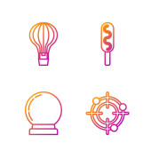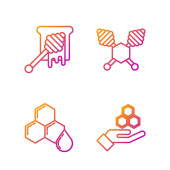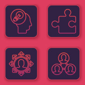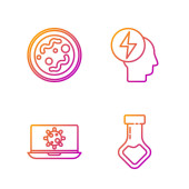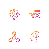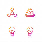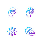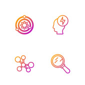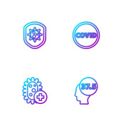 Ustaw linię Atom, Głowa i symbol elektryczny, Tarcza chroniąca przed wirusami i cząsteczkami. Ikony kolorów gradientu. Wektor.