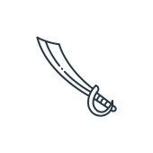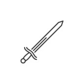 Zdjęcie "Ikona wektora miecza. Miecz edytowalny udar. symbol liniowy miecza do stosowania w aplikacjach internetowych i mobilnych, logo, mediach drukowanych. Cienka ilustracja. Rysunek zarysu izolowanego wektora." może być wykorzystywane do celów osobistych i komercyjnych zgodnie z warunkami zakupionej licencji Royalty-free. Obraz jest dostępny do pobrania w jakości wysokiej rozdzielczości do 5760x3840.
