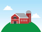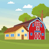 Dom rustykalny na zielonej łące, zabudowa rolnicza. Płaski wektor ilustracja na tle błękitnego nieba z chmurami