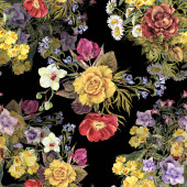Płynny wzór z bukietem kwiatów, liści, jagód, gałązek