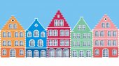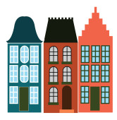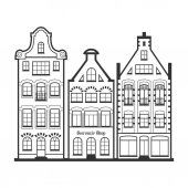 Zestaw starych europejskich budynków. Fasady zabytkowych domów w stylu holenderskim. Sylwetka wektorowa, wzór szablonu świątecznej kartki okolicznościowej, baner, plakat, cięcie laserowe i ploterowe, świąteczne wzory i dekoracje. Elementy dekoracyjne