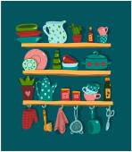 półki z naczyniami i produktami w kuchni. Wektor płaska ilustracja. przygotowywanie żywności.