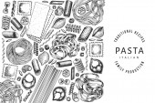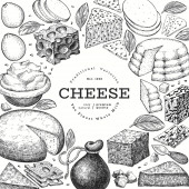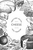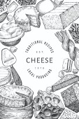Wzór serowy. Ręcznie rysowane wektorowe mleczne ilustracje. Grawerowany styl różnych rodzajów sera baner. Vintage tło żywności.