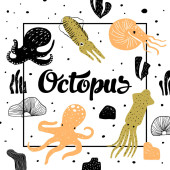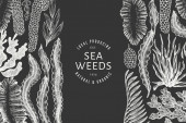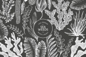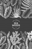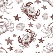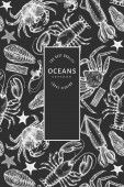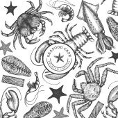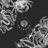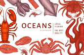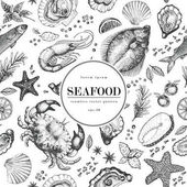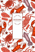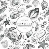 Szablon projektu owoców morza. Ręcznie rysowane wektorowe owoce morza ilustracji. Grawerowany baner z jedzeniem. Tło dla zwierząt morskich z retro