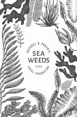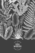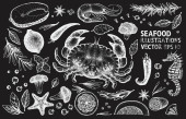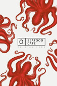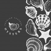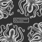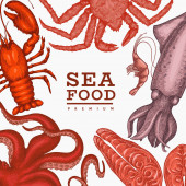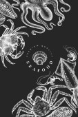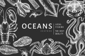 Szablon projektu owoców morza. Ręcznie rysowane wektorowe owoce morza ilustracji. Grawerowany baner z jedzeniem. Tło dla zwierząt morskich z retro