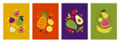 Owoce bazgrołów. Kreskówkowe zabawne postacie jagód i cytrusów ze szczęśliwymi twarzami, tropikalne jedzenie z uroczymi emocjami kawaii. Zestaw wektorów