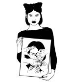 Zdjęcie "Wektor ręcznie rysowane płaską ilustrację kobiety z draperii i zabytkowej głowy Apollo izolowane. Sztuka tatuażu. Szablon na wizytówkę, plakat, baner, nadruk na t-shirt, pin, odznakę, łatkę." może być wykorzystywane do celów osobistych i komercyjnych zgodnie z warunkami zakupionej licencji Royalty-free. Obraz jest dostępny do pobrania w jakości wysokiej rozdzielczości do 5760x3840.