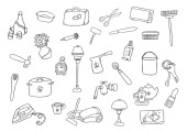Doodle sprzęt do sprzątania domu ikony ustawione w wektorze. Ręcznie rysowane przybory do sprzątania domu ikona zestaw w wektorze. Kolekcja ikon sprzątania domu doodle.