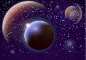 Abstrakcyjny wszechświat z planetami i jasnymi gwiazdami. Wpływ światła halo na ciemne tło, błyski światła. Ilustracja przestrzeni wektora.