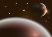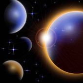 Abstrakcyjny wszechświat z planetami i jasnymi gwiazdami. Wpływ światła halo na ciemne tło, błyski światła. Ilustracja przestrzeni wektora.
