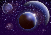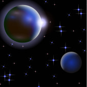 Abstrakcyjny wszechświat z planetami i jasnymi gwiazdami. Wpływ światła halo na ciemne tło, błyski światła. Ilustracja przestrzeni wektora.