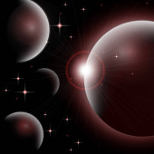 Abstrakcyjny wszechświat z planetami i jasnymi gwiazdami. Wpływ światła halo na ciemne tło, błyski światła. Ilustracja przestrzeni wektora.
