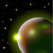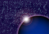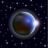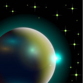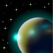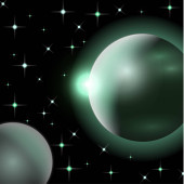 Abstrakcyjny wszechświat z planetami i jasnymi gwiazdami. Wpływ światła halo na ciemne tło, błyski światła. Ilustracja przestrzeni wektora.