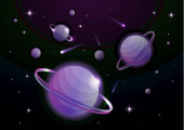 Abstrakcyjny wszechświat z planetami i jasnymi gwiazdami. Wpływ światła halo na ciemne tło, błyski światła. Ilustracja przestrzeni wektora.