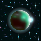 Abstrakcyjny wszechświat z planetami i jasnymi gwiazdami. Wpływ światła halo na ciemne tło, błyski światła. Ilustracja przestrzeni wektora.