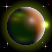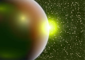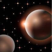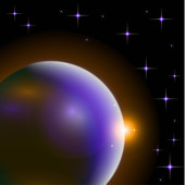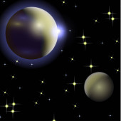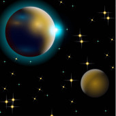 Abstrakcyjny wszechświat z planetami i jasnymi gwiazdami. Wpływ światła halo na ciemne tło, błyski światła. Ilustracja przestrzeni wektora.