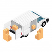 Samochód ciężarowy z brązowymi kartonowymi pudełkami izolowanymi na białym tle widoku izometrycznego. Dostawa przesyłek