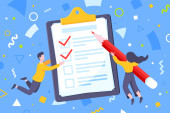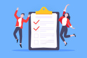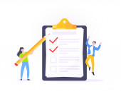 Zadanie wykonane koncepcja biznesu z malutką osobą z megafonem i ołówkiem w pobliżu gigantyczny schowek z pełną listą kontrolną.