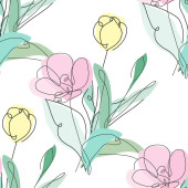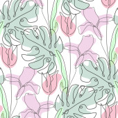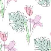 Zdjęcie "Elegancki bezszwowy wzór z tęczówki, tulipan, potwór, elementy konstrukcyjne. Kwiatowy wzór na zaproszenia, karty, nadruk, opakowanie na prezent, produkcja, tekstylia, tkaniny, tapety. Ciągły styl sztuki linii" może być wykorzystywane do celów osobistych i komercyjnych zgodnie z warunkami zakupionej licencji Royalty-free. Obraz jest dostępny do pobrania w jakości wysokiej rozdzielczości do 5760x3840.