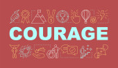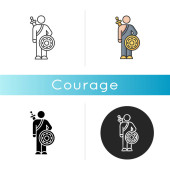Odwagi czarna ikona glifu. Uczucie odwagi, nieustraszoności. Ludzka psychologia, symbol stanu psychicznego na białej przestrzeni. Odważna osoba, bohater z mieczem i wektorem tarczy odizolowana ilustracja