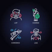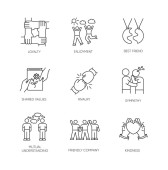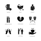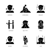 Pozytywne i negatywne emocje czarne ikony glifów ustawione na białej przestrzeni. Ludzkie uczucia, zachowania emocjonalne, symbole sylwetki nastroju. Uczucie, szczęście, przyjemność i zazdrość. Ilustracja izolowana wektora