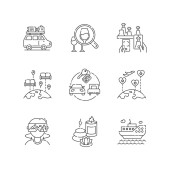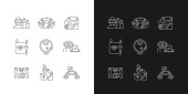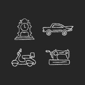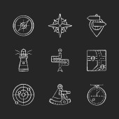 Rodzaje turystyki kreda białe ikony ustawione na czarnym tle. Wycieczka, degustacja wina, turystyka atomowa i wycieczki pakietowe. Rekreacja w wakacje. Izolowane ilustracje tablic wektorowych
