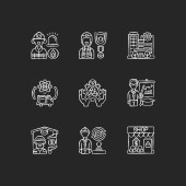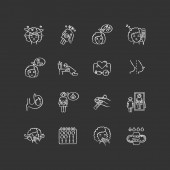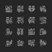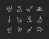 Urlop turystyka kreda białe ikony ustawione na czarnym tle. wakacyjne przygody i zajęcia rekreacyjne. Luksusowe usługi wycieczek i budżetu podróży. Izolowane ilustracje tablic wektorowych
