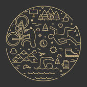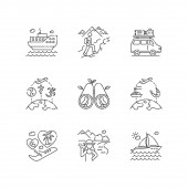 Wycieczka wakacyjna kreda białe ikony ustawione na czarnym tle. Aktywna turystyka, przygoda i podróże. Różne atrakcje turystyczne w czasie wakacji. Izolowane ilustracje tablic wektorowych