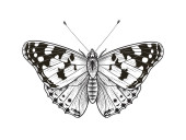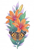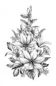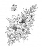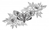 Zdjęcie "Ręcznie rysowane kwiaty i motyl izolowane na czystym tle. Czarno-biały kwiat i ćma widok z góry. Wektor monochromatyczna elegancka kompozycja kwiatowa w stylu vintage, projekt tatuażu, strona kolorowanki." może być wykorzystywane do celów osobistych i komercyjnych zgodnie z warunkami zakupionej licencji Royalty-free. Obraz jest dostępny do pobrania w jakości wysokiej rozdzielczości do 5760x3840.