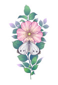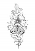 Ręcznie rysowane kwiaty i motyl izolowane na czystym tle. Czarno-biały kwiat i ćma widok z góry. Wektor monochromatyczna elegancka kompozycja kwiatowa w stylu vintage, projekt tatuażu, strona kolorowanki.