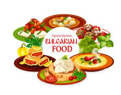 Bułgarski projekt wektorów żywieniowych dań mięsnych, warzywnych i serowych. Sałatki z ogórka jogurtowego i kapusty, pieprz pomidorowy chutney lutenitsa, tosty z cukinii z bryndzą i zupą wołową, kuchnia bułgarska