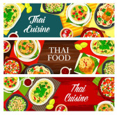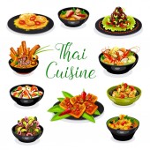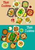 Tajska kuchnia owoce morza i dania mięsne, wektorowe jedzenie. Sałatka z kałamarnic warzywnych, zupy z kurczaka i miso, czerwona pasta curry, bulion krewetkowy i pad tajski, ryby w sosie kokosowym, bakłażan curry i krewetki imbirowe
