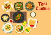 Zdjęcie "Tajska kuchnia owoce morza i dania mięsne, wektorowe jedzenie. Sałatka z kałamarnic warzywnych, zupy z kurczaka i miso, czerwona pasta curry, bulion krewetkowy i pad tajski, ryby w sosie kokosowym, bakłażan curry i krewetki imbirowe" może być wykorzystywane do celów osobistych i komercyjnych zgodnie z warunkami zakupionej licencji Royalty-free. Obraz jest dostępny do pobrania w jakości wysokiej rozdzielczości do 5760x3840.