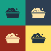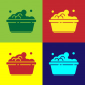 Zestaw Plastikowa umywalka z ikoną piór mydlanych izolowana na czarno-białym tle. Miska z wodą. Ubrania do prania, środki czystości. Ilustracja wektora.