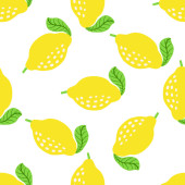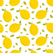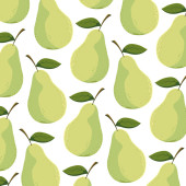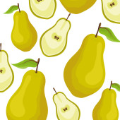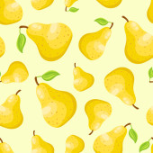 Wektor bezszwowy wzór żółtych gruszek z zielonymi liśćmi na białym tle. Różne rozmiary gruszek. Do drukowania na tkaninach, serwetkach, opakowaniach itp..