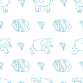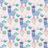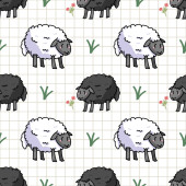 Bezbarwny wzór z czarnych baranów i białe owce wypasu trawy w zielonym polu w stylu kreskówki. Wielokolorowe stokrotki, kwiaty róż i tulipanów.