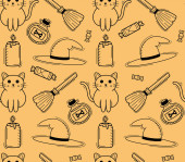Bezbarwny wzór doodle bezszwowy z akcesoriami kota i słowa Miau i mruczenie. Nadaje się do marki zwierząt domowych, sklep, blog. Zabawki, drapaczka, kołnierz, miska, jedzenie, woda, smakołyki, trawa, narzędzia do pielęgnacji, kuweta.