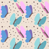 Wektor bezszwowe tło wzór z motyli w różowe, niebieskie i ciemne, żółte i brązowe kropki polka. Nadaje się jako tapety, opakowania, tło internetowe, papier pakowy.