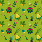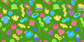 Kolorowy, świeży i słodki wiosenno-letni motyw bezproblemowy wzór. Narzędzia ogrodnicze i sprzęt na tle kropki polki. Pastelowe kolory.