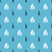 Wektor płaski bezszwowy wzór dużych zielonych szklanych butelek oleju z etykietą, pusty i pełny, na drewnianym stole z rozlanym olejem. Tło dla strony internetowej, menu restauracji, papier do pakowania.