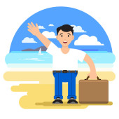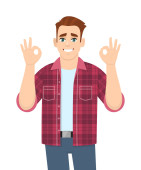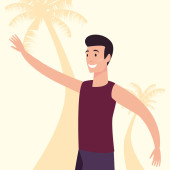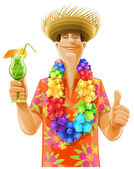 Szczęśliwy facet w czerwonej hawajskiej koszuli pokazuje "Kciuki do góry". Wakacje na Hawajach. Koncepcja spędzenia wakacji. Ilustracja w stylu płaskiej kreskówki z cute charakter.