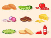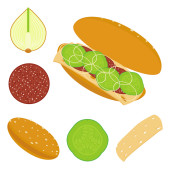 Burger składniki Diy kolekcji. Zestaw odizolowanych składników do budowy własnego burgera i kanapki. Pokrojone warzywa, sosy, bułka i kotlet na hamburgera. Wektor burger maker