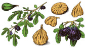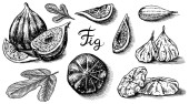 Świeże figi gotowe. Przyprawa do detoksykacji. Suszone owoce, kawałki. Liście, rośliny i gałęzie. Wektor Rysowany ręcznie szkic do etykiety, plakatu lub menu.