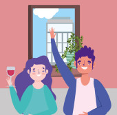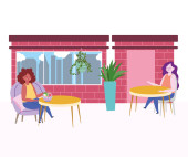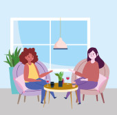 społeczna odległość restauracja lub kawiarnia, kobieta ze szklanym winem i dziewczyna siedzi przy stole, covid 19 koronawirus, nowe normalne życie